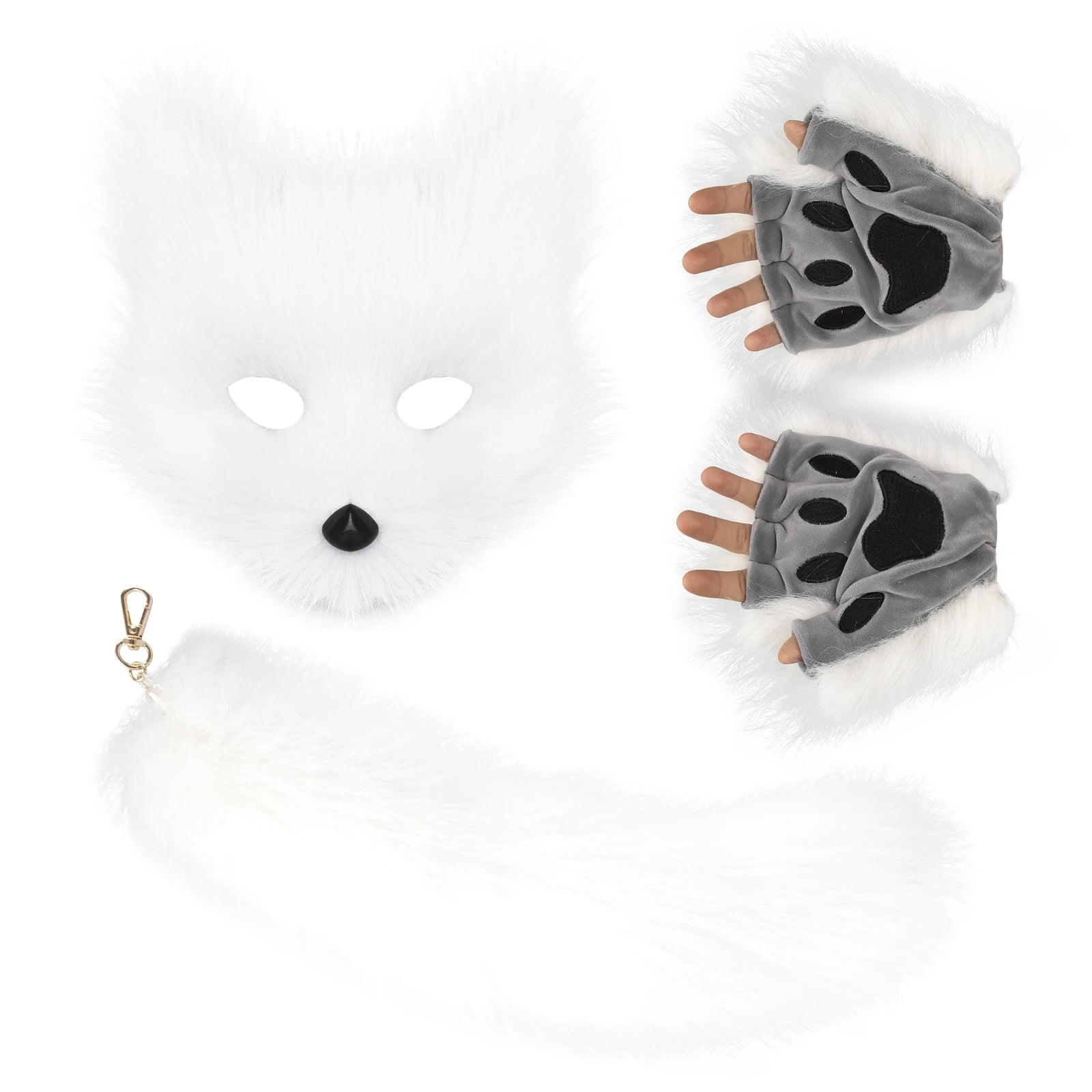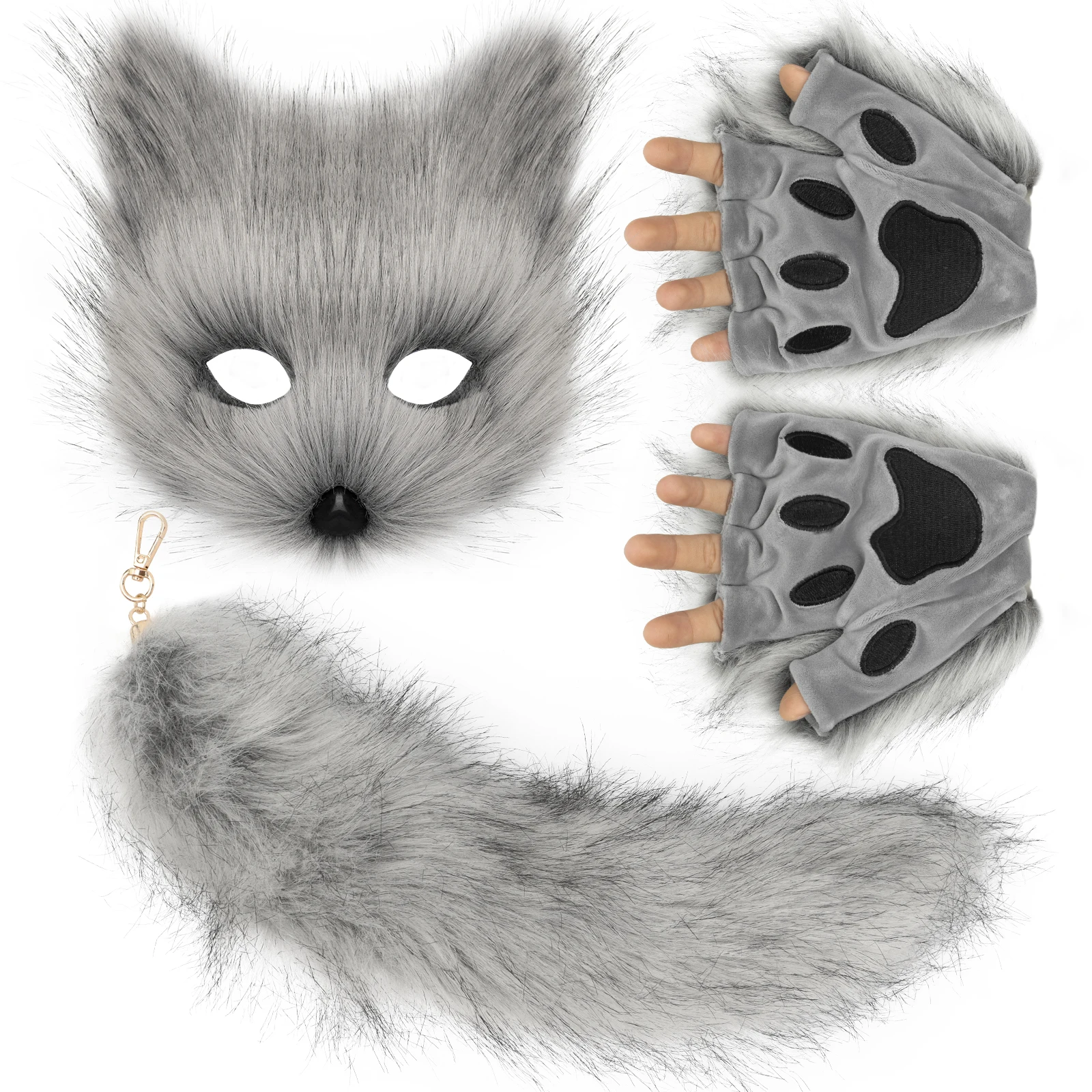 LLavero de cola de zorro de piel esponjosa, guantes con patas de gato y máscara de lobo Therian, conjunto para accesorios de disfraz de Halloween